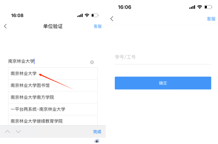 第二步:进入选择单位页面后,输入“南京林业大学”并点击进入学工号绑定。