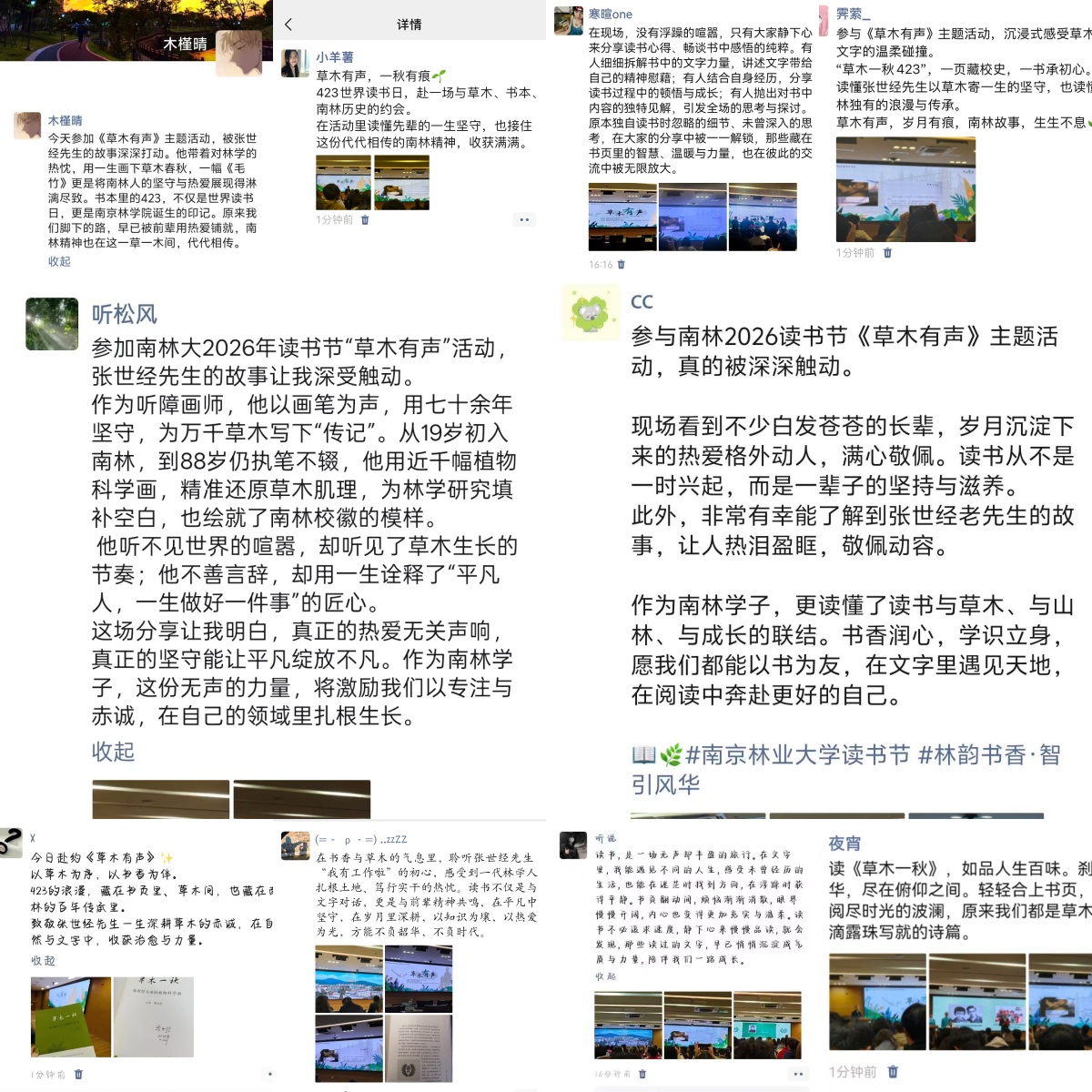 草木无言,生长有声;青春有志,奋斗无涯。本次《草木有声》主题活动由图书馆、博物馆、档案馆主办,是一场关于阅读的盛会,更是一场关于坚守、热爱与生命力的精神洗礼,是学校探索思政美育微课堂、落实场馆育人的实践。学校将继续以书香校园建设为抓手,推动生态文明教育与文化育人深度融合,激励每一位南林人传承“诚朴雄伟、树木树人”的校训精神,像参天大树一样脚踏实地、潜心学术,在建设美丽中国的新征程上贡献智慧与力量。